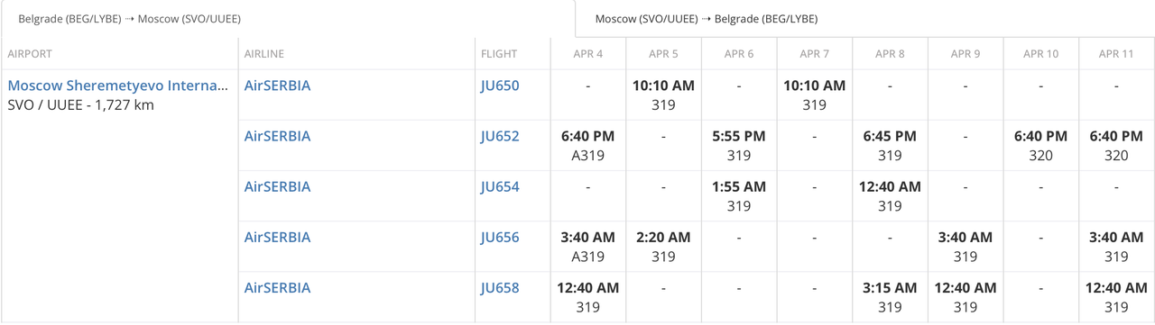 Tacno 14 letova je u planu u narednih 7 dana. Leti A319 za SVO jer su trenutno oba A320 AOG.
