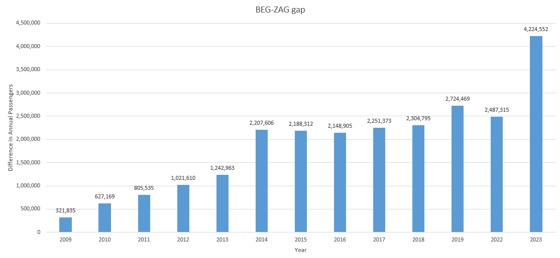 Tragično je da će Croatia tek 2024. vratiti broj putnika iz 2019. (tako sama kaže), iako je ogromna većina prijevoznika to već napravila 2023. godine. Uz to Air Serbia je enormno narasla u zadnjih dvije godine. 45 novih i obnovljenih linija u dvije godine, ogroman broj dodatnih frekvencija, čak 14 aviona više (90% više) nego 2021, 53% više putnika nego 2022. čak 179% više nego 2021. Croatia ne samo da zaostaje, nego nije ostvarila ni pola putnika Air Serbie, ona je totalno izgubila bitku sa Air Serbiom. Air Serbia je stvorila hub u Beogradu, Croatia je svoj minijaturan i skroman hub iz 2019. u Zagrebu potpuno uništila. Air Serbia ima brdo linija iz Beograda, njih 79, Croatia iz Zagreba ima tek 21 liniju, od čega su tri sa 1 stop, dakle, četiri puta manje. Prošlog ljeta Croatia je imala 185 nonstop letova iz Zagreba, Air Serbia je imala 573 leta, tri puta više. I sad mi recite kojom će kompanijom letjeti potencijalni putnik iz Skopja, Air Serbiom ili Croatiom, gdje će biti više putnika, koja linija će imati više frekvencija i bolji load faktor?